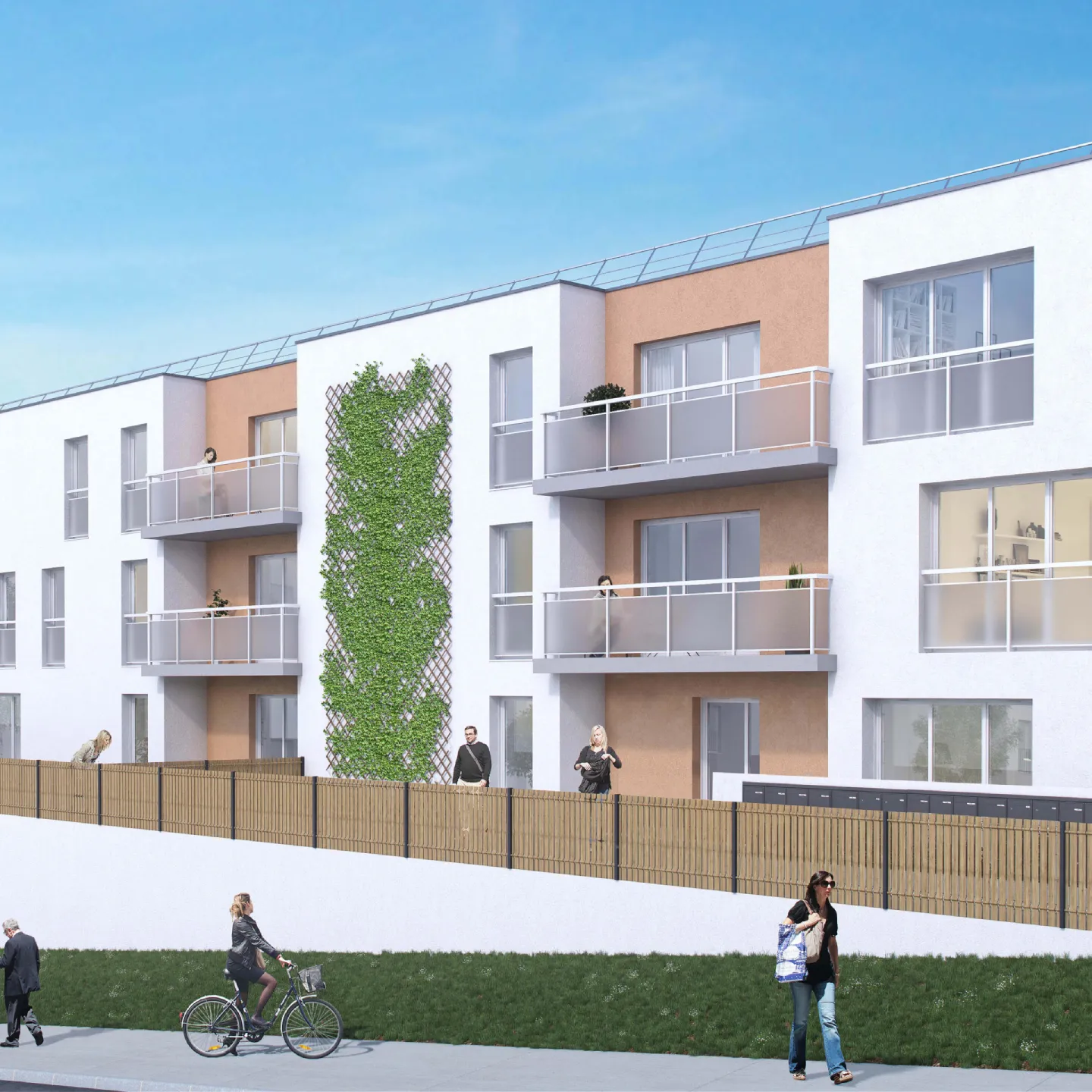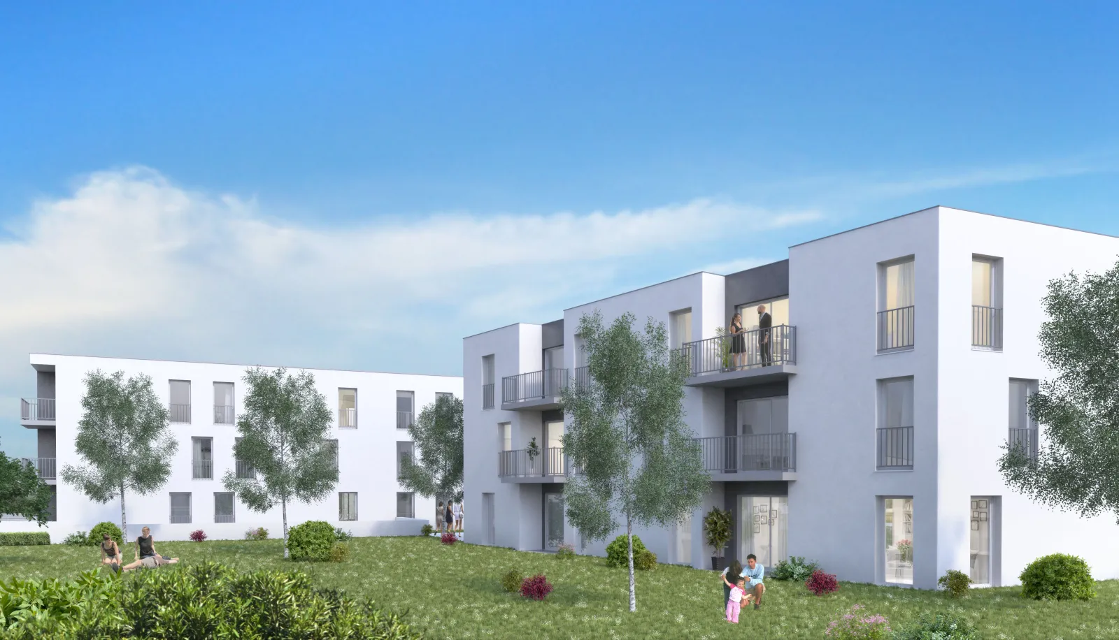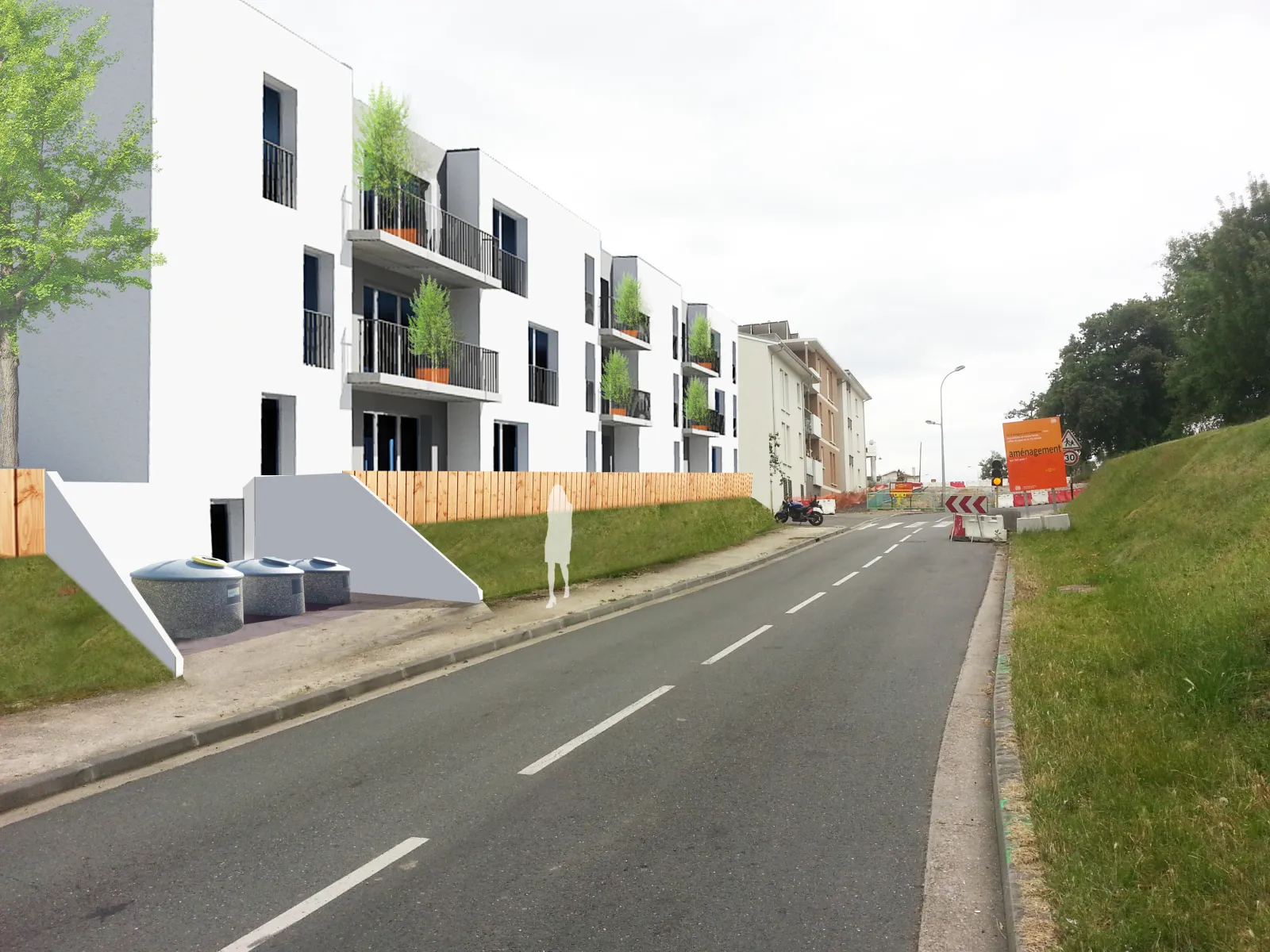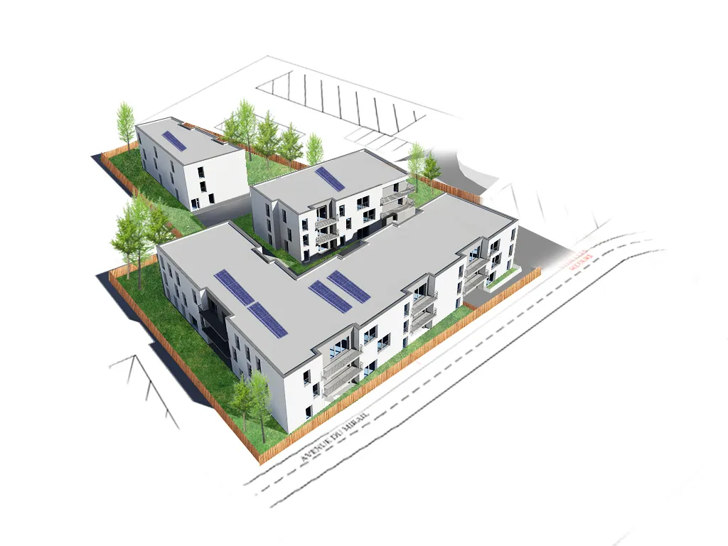 Les bâtiments s'inscrivent dans la continuité du bâti existant sur les parcelles voisines et sera construit en R+2. La plupart des logements dispose d'un balcon-terrasse afin de donner un espace à vivre supplémentaire aux appartements. L'opération prévoit une grande diversité d'appartements, allant du T2 au T5 pour favoriser la mixcité sociale et permettre au plus grand nombre d'accéder à la propriété. L'ensemble des constructions sera habillé avec un enduit ton blanc cassé. Les creux des balcons-terrasses seront quant à eux revêtus d'un enduit ton gris.