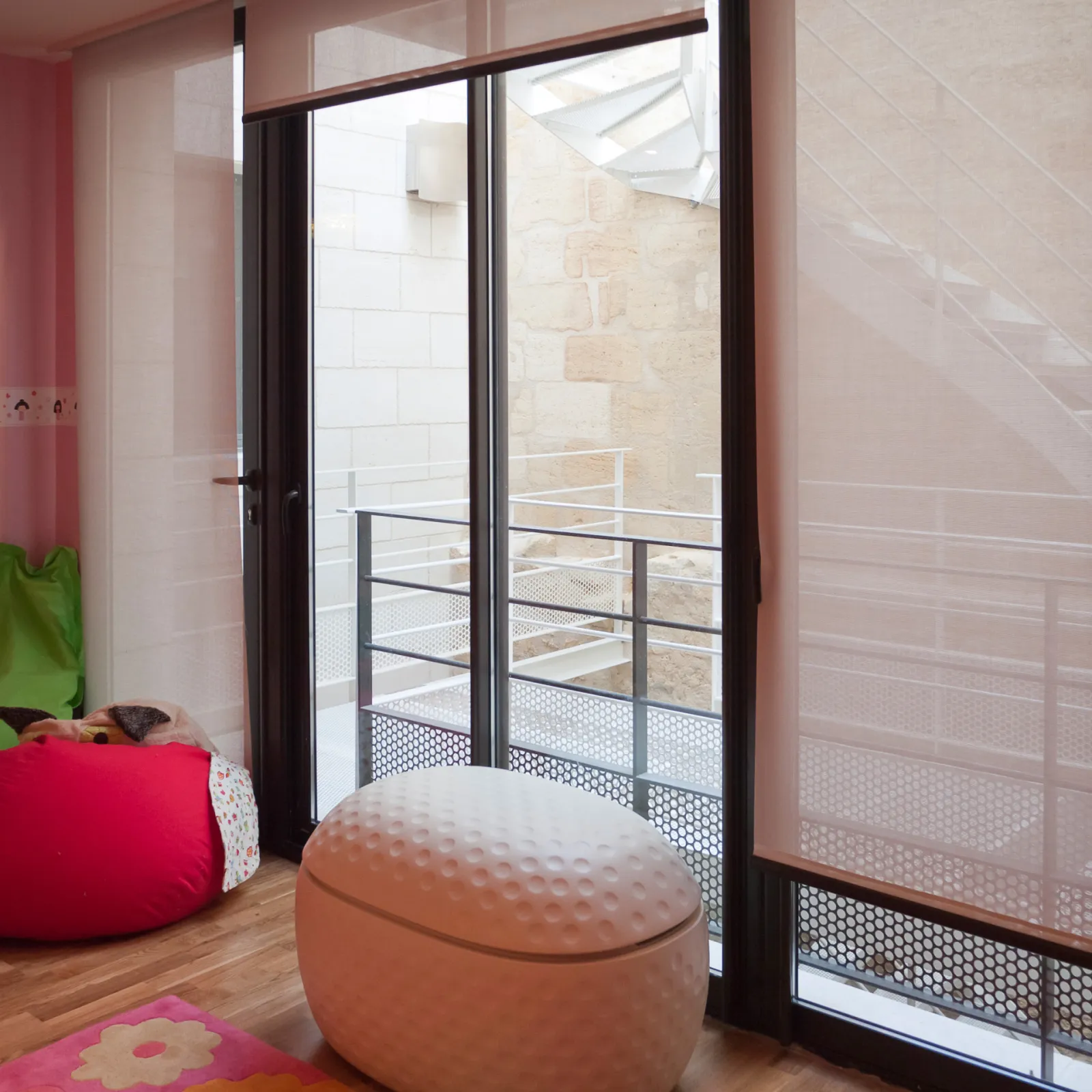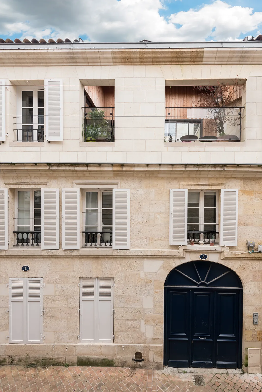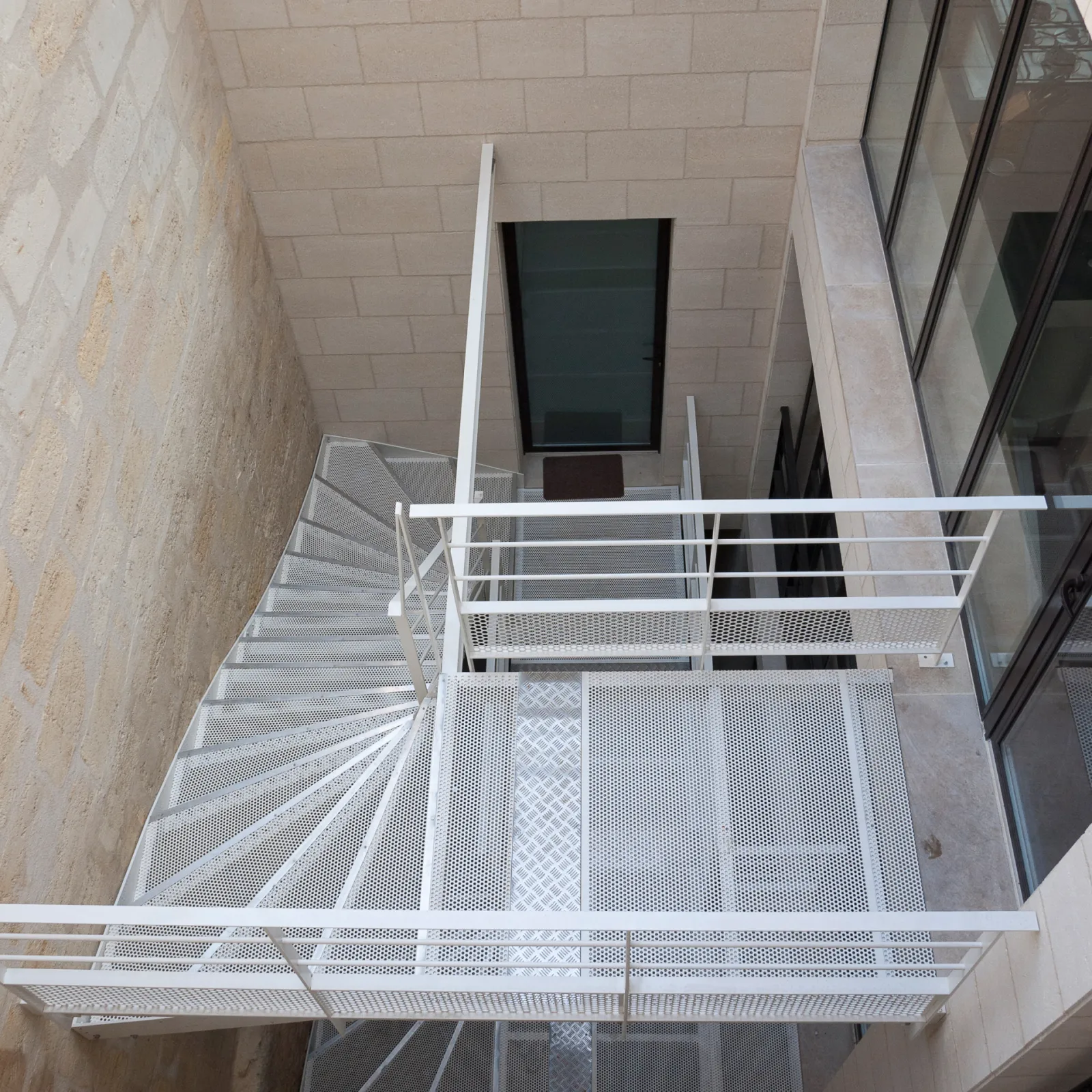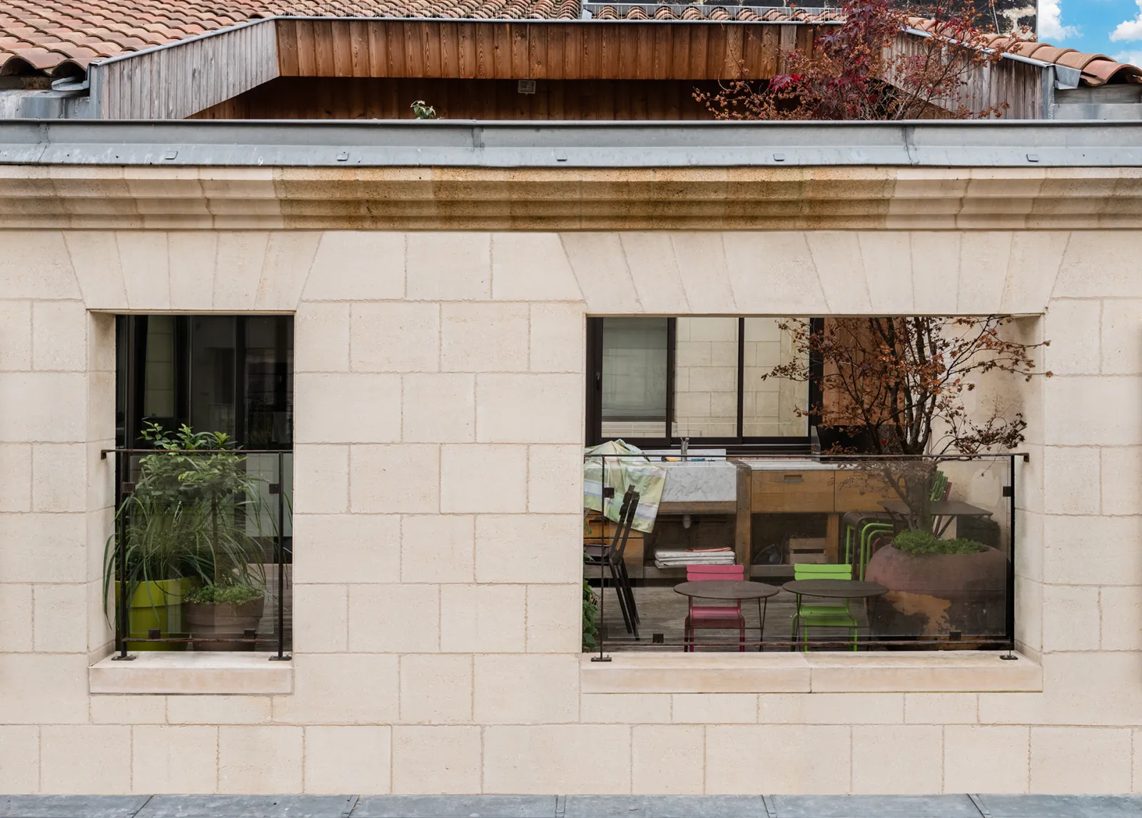 Le projet à nécessité des fondations profondes, des nouveaux planchers béton, un escalier et passerelle métallique et un placage pierre sur la façade sur rue. Une terrasse a été aménagée au R+2
