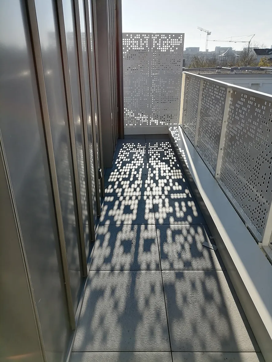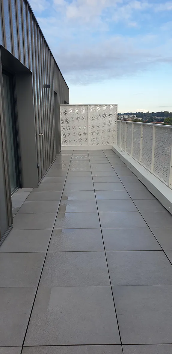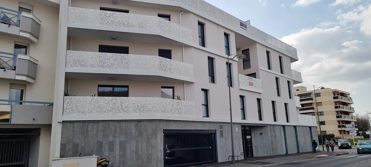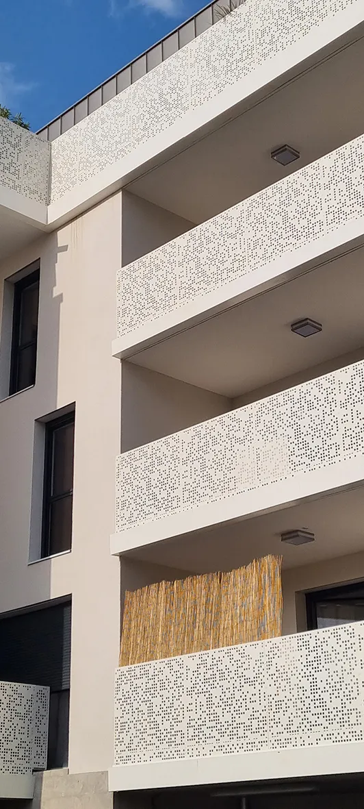 La verticalé du soubassement et le traitement des ouvertures s'équilibrent avec les lignes horizontales créées par les nez de plancher, les balcons et les terrasses. Comme une parrure de dentelle, les garde-corps en métal finement ouvragés laqués de blanc dessinnent