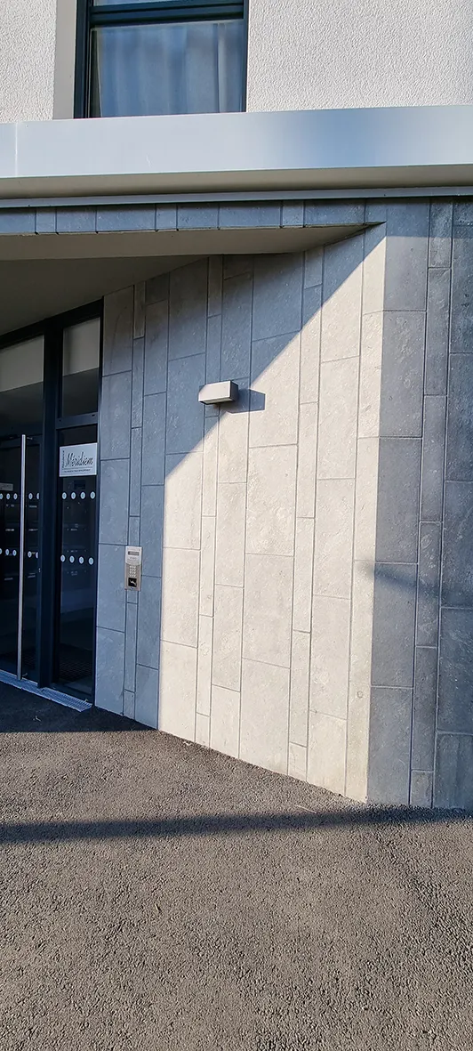 Tel un vaisseau amarré, Méridiem présente sa proue à l'angle de deux rues et dévoile sa silhouette majestueuse. Elle s'intègre parfaitement dans son environnement. Ce projet dégage une harmonie subtile de contrastes et de perspectives. Le RDC reçoit un parement pierre gris vertical qui assoit le bâtiment et qui contraste avec la blacnheur des étages et qui répond au bardage zinc de l'attique. Les menuiseries en aluminium gris anthracite permettent et leurs rythmes complètent la composition architecturale.