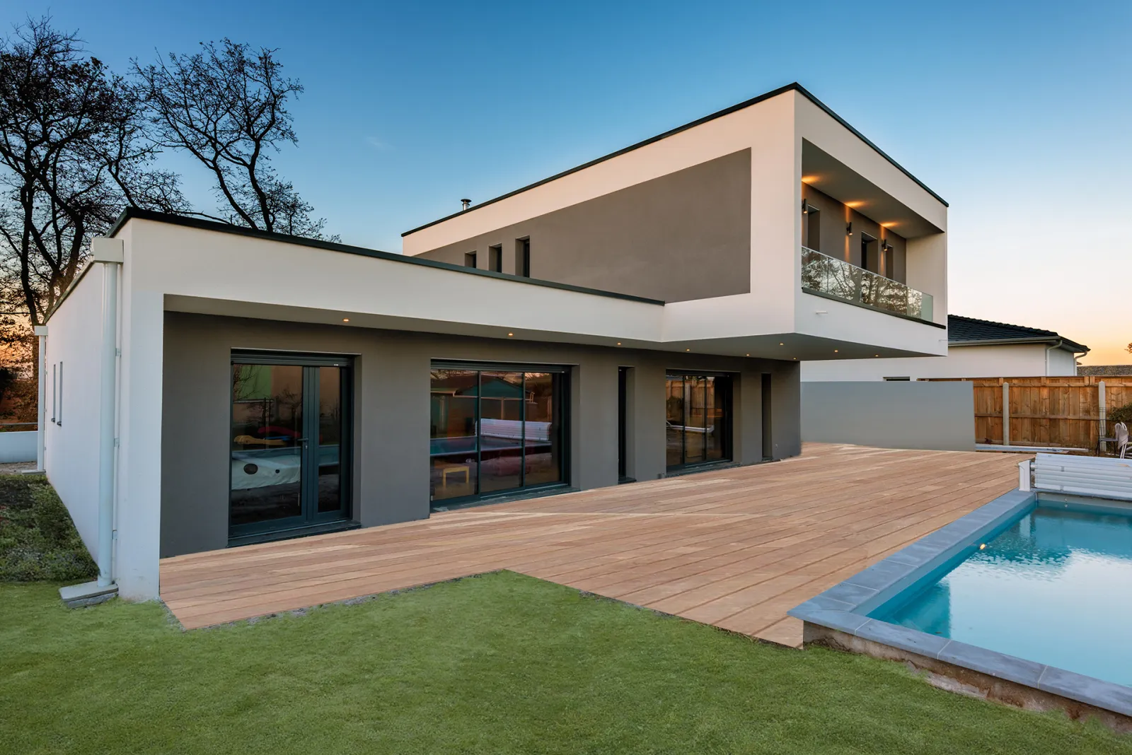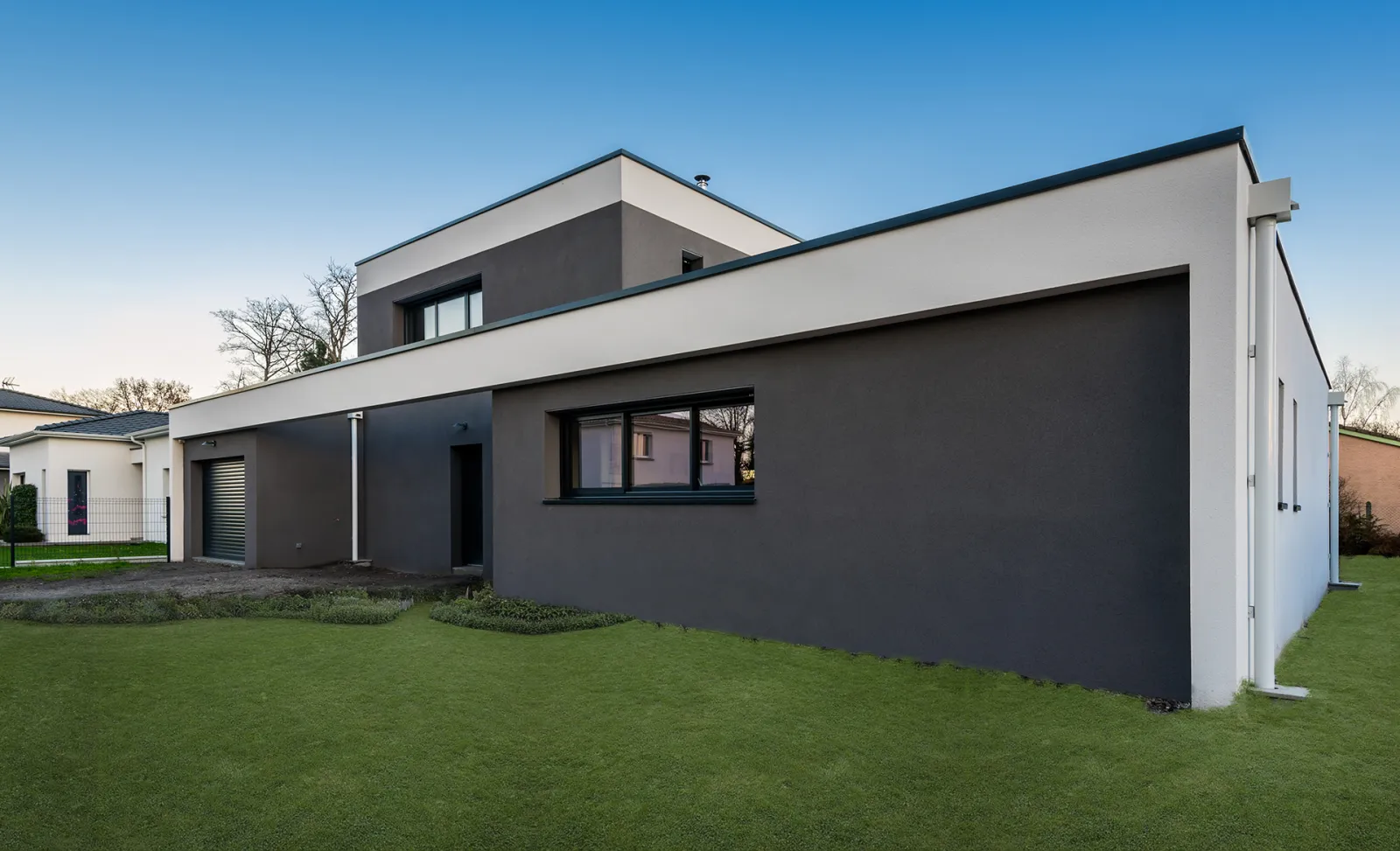 La maison se compose de 3 volumes orientés vers le Sud Est. Un volume pour le garage à l'est, le deuxième pour le salon séjour et le troisième en partie en porte à faux pour les chambres des enfants à l'étage.