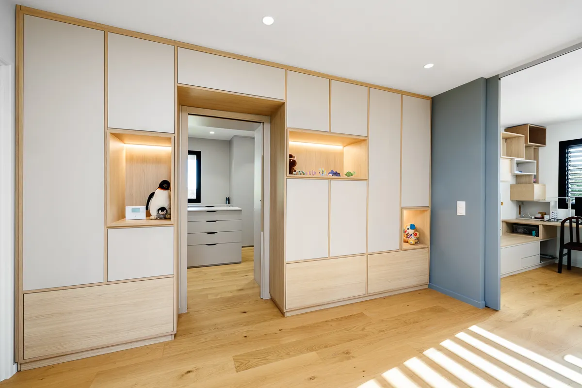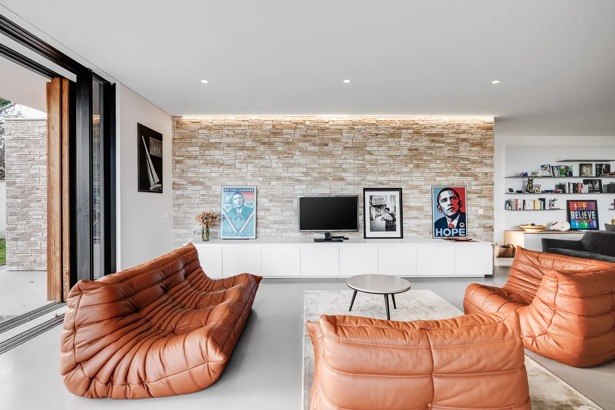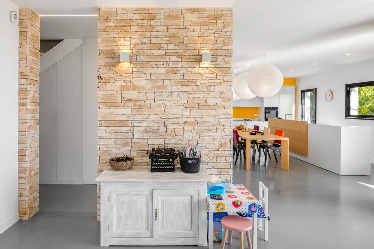Un étage sur le côté de la maison, vient compléter le volume habritant ainsi les chambres. Un jeu de volume entre le RDC et R+1 par le biais d'une mezzanine permet de connecter les deux espaces. Nous retrouvons un habillage bois qui se marie parfaitement avec la teinte des murs en pierre et les menuiseries aluminium noires.