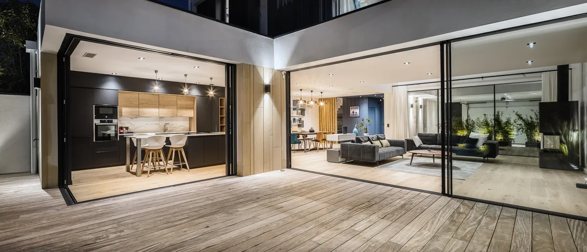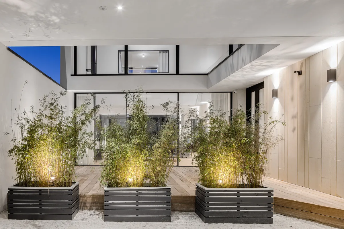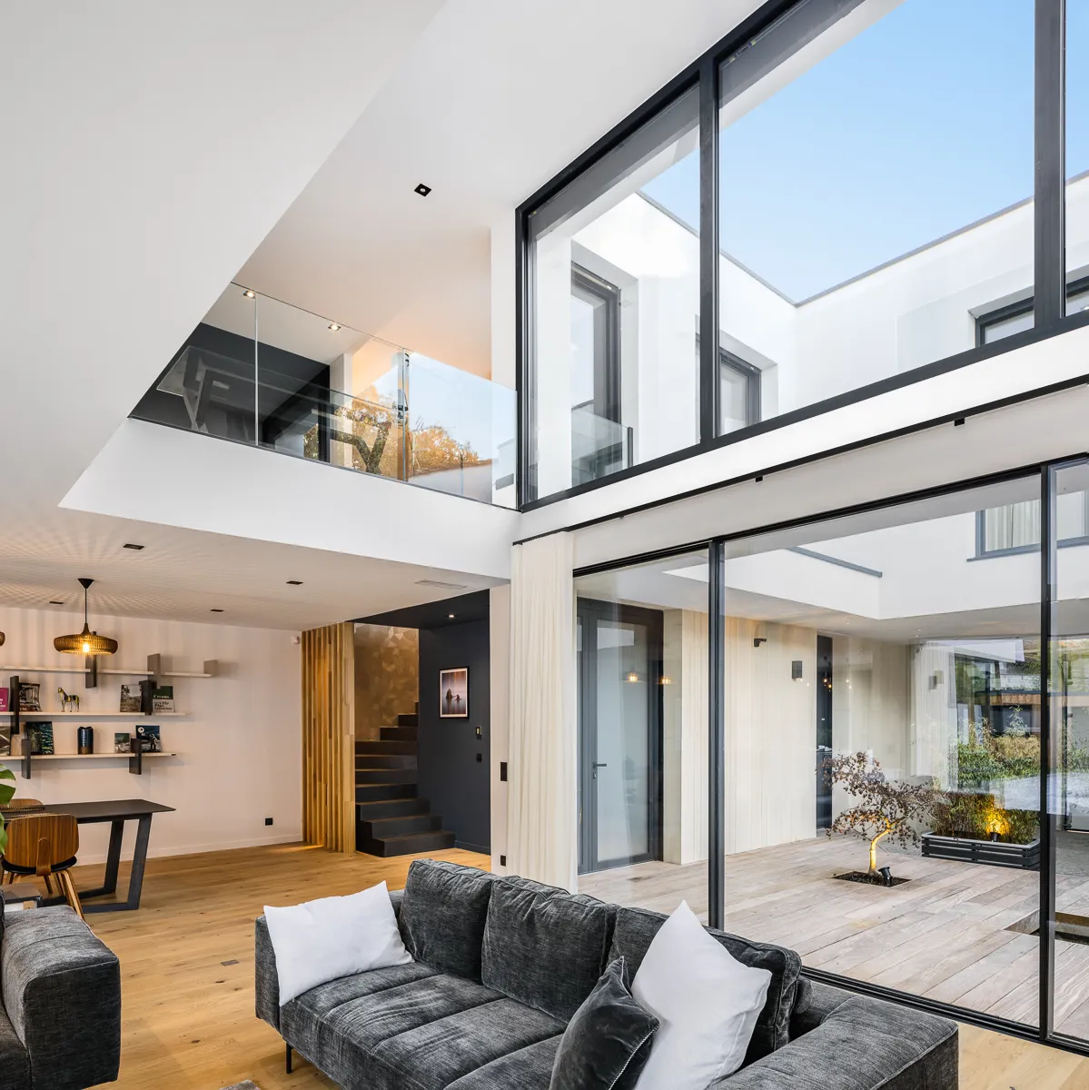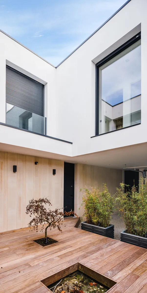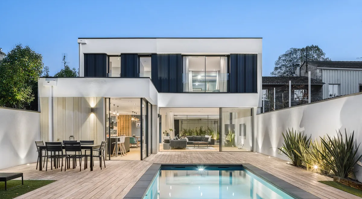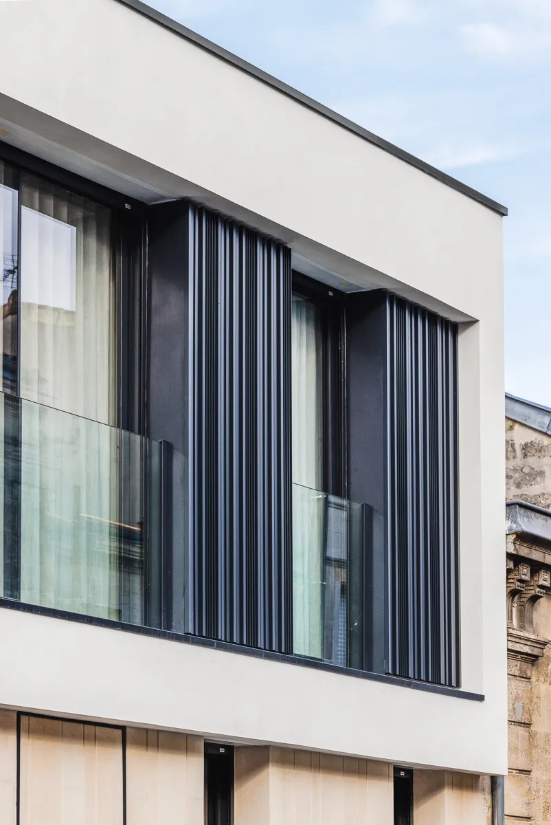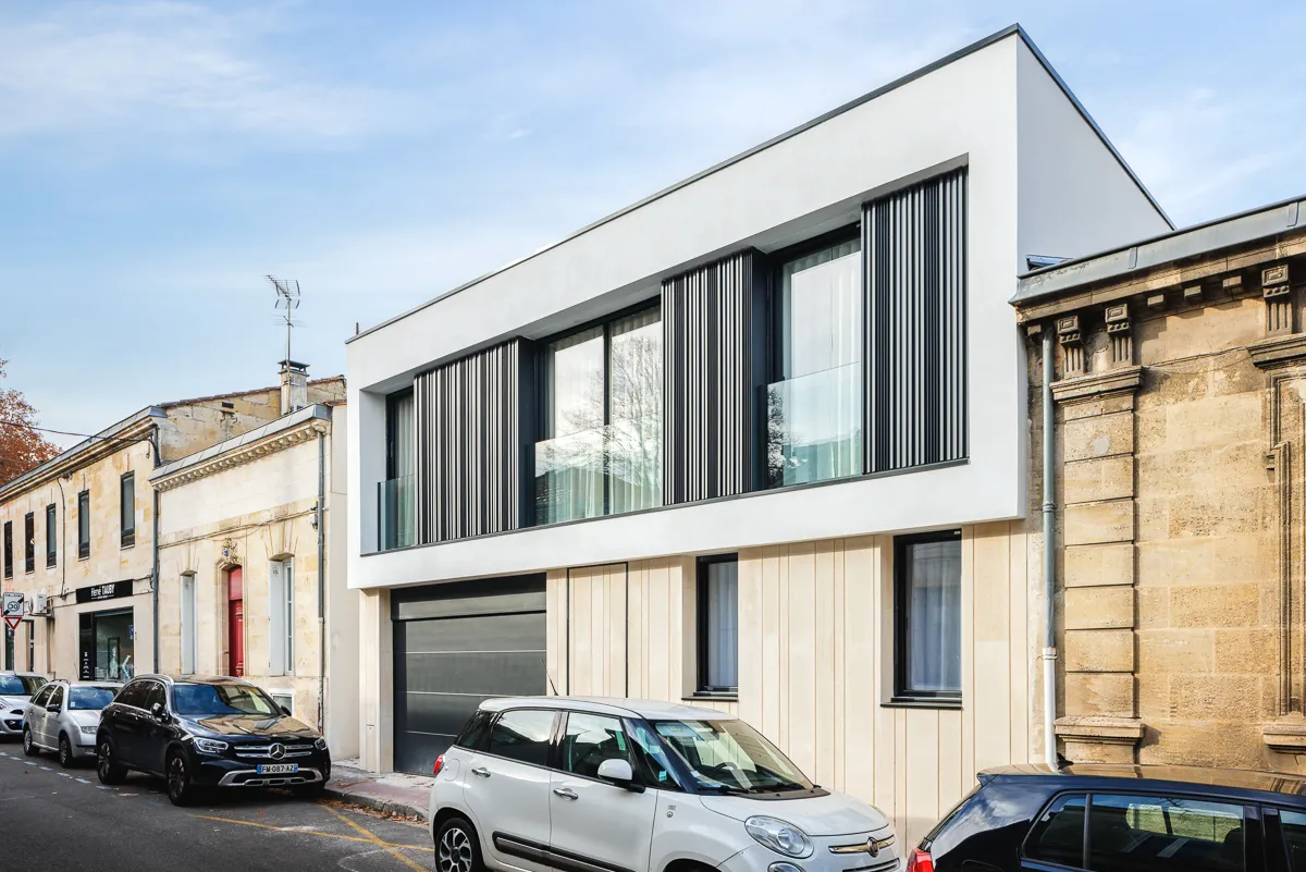 Construction d'une maison individuelle en plein cœur du centre ville du Bouscat. La façade sur rue s'insère dans un environnement d'échoppes typiques bordelaise. Pour venir s'intégrer dans ce contexte, le RDC de la façade sur rue reprend le langage de la pierre bordelaise mais revisité de façon contemporain avec un rythme particulier. Ce parement pierre se retrouve à l'intérieur de la maison ainsi que sur la façade arrière. Un bardage métallique également vertical avec des largeurs et des épaisseurs différentes, habille l'étage et contribue encore d'avantage à un traitement dynamique des façades. Ce bardage se retrouve également sur la façade arrière. Des menuiseries minimalistes viennent compléter cette lecture architecturale et permettent ainsi une meilleur transparence extérieur-intérieur.