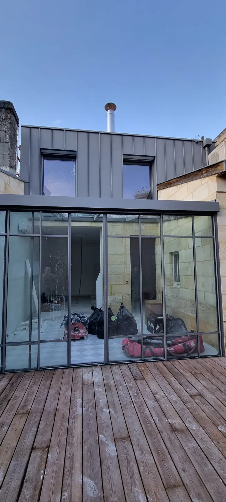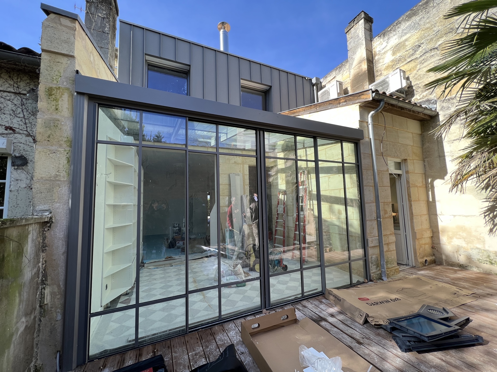 Rénovation et surélévation d’une échoppe double à proximité du parc Bordelais. Le RDC accueille la chambre parentale, une salle d’eau et les pièces de vie donnant sur le jardin tandis que l’étage offre trois chambres et une salle de bain. La façade sur rue est conservée et restaurée, la surélévation est réalisée avec une finition en zinc à joint debout côté rue et côté jardin. La composition des façades reste classique pour s’intégrer au mieux dans le tissu urbain. Une grande verrière est mise en place côté jardin au Nord, apportant ainsi une luminosité douce et constante aux pièces de vie du RDC. Les menuiseries et les gardes corps sont dans le même ton que le zinc de façade. Ce projet sublime une échoppe Bordelaise en la démarquant des autres.
