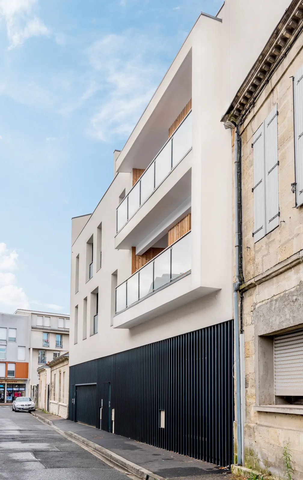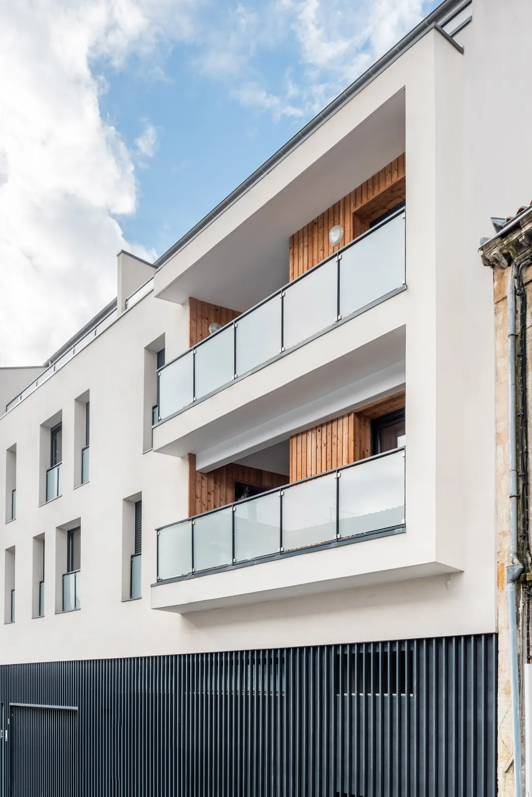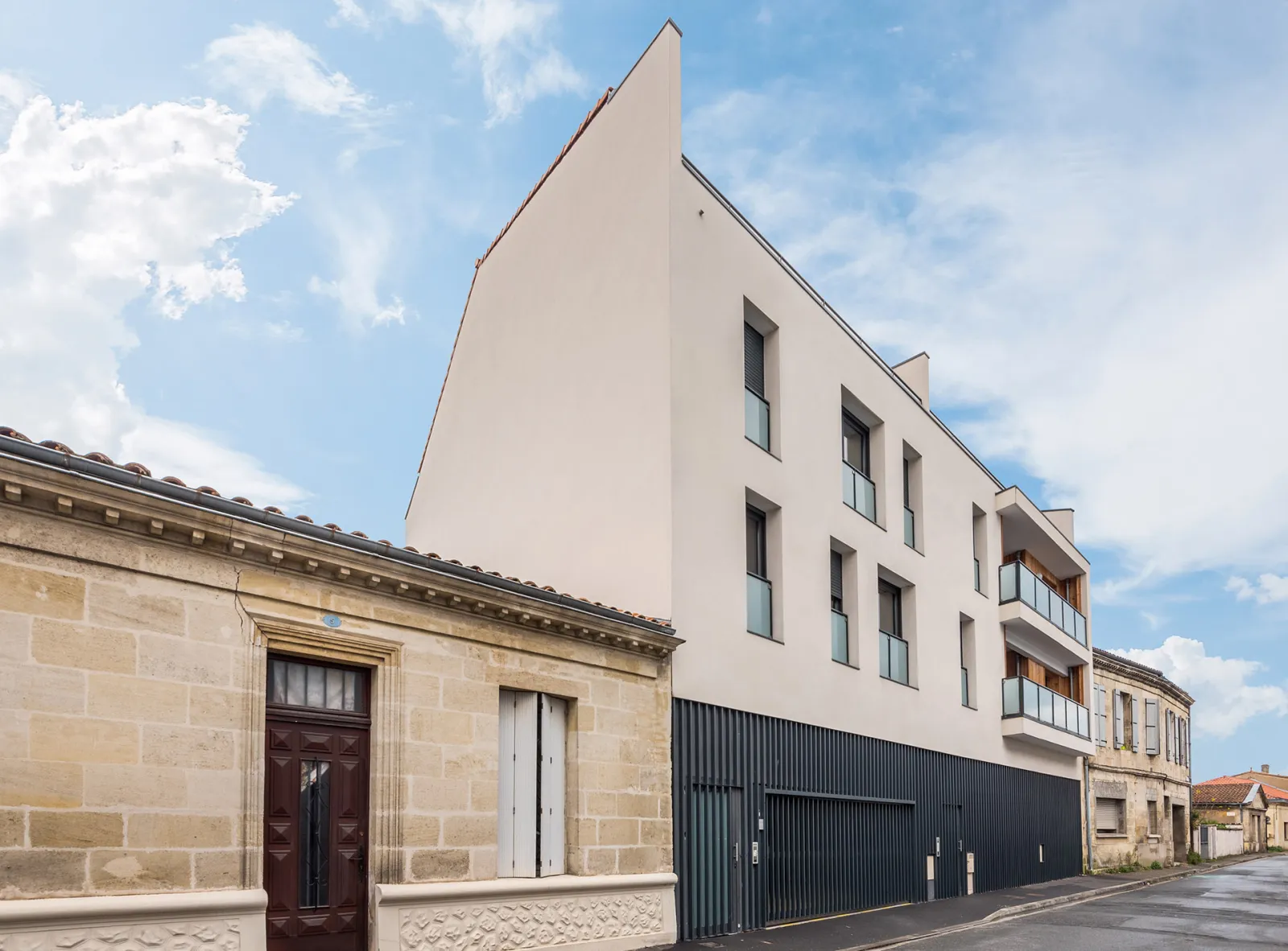 Ce projet de logement collectif prévoit un esemble de 12 logements. Chaque logement dispose d'une terrasse afin de favoriser au maximum l'éclairage des espaces de vie par une lumière naturelle. La façade sur rue reçoit un traitement en tôle aluminium gris anthracite pour le soubassement, une agraffe béton au R+1 et R+2 couvrant des terrasses, un rythme d'ouverture aléatoire et dynamique. Le R+3 en attique permet de bénéficier d'une terrasse sur toute la largeur du bâtiment.