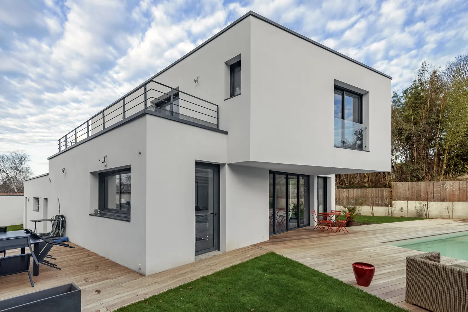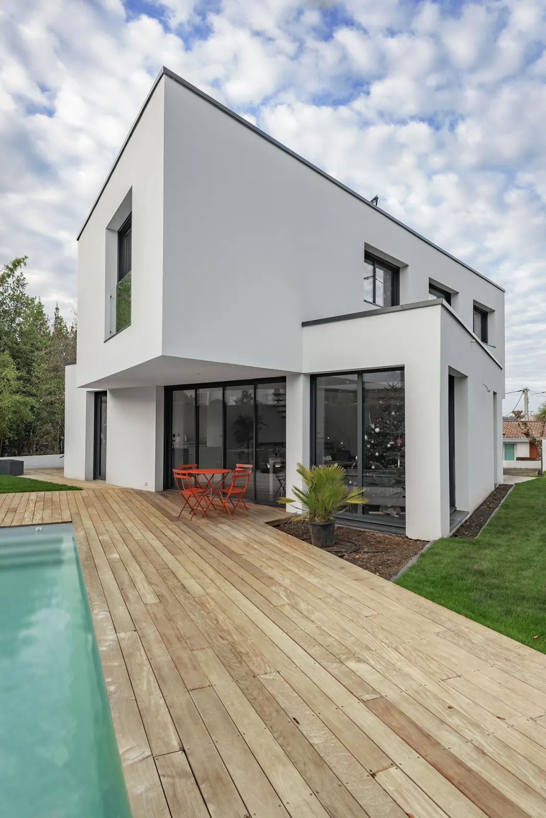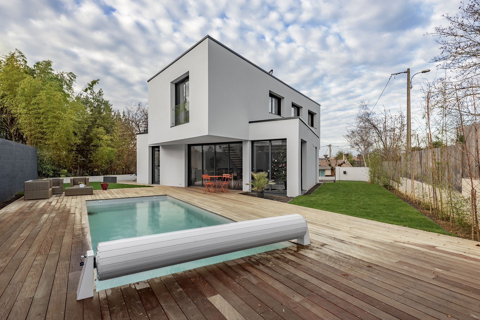La conception de cette maison s'appuie sur la pente naturelle du terrain pour proposer des espaces à différents niveaux. Le projet se compose de 3 volumes imbriqués qui accueillent chacun des espaces spécifiques. Cela confère au projet des lignes dynamiques. Un porte à faux à l'étage s'élance au dessus de la terrasse pour protéger les ouvertures du RDC. Cet étage permet de créer des perspectives intérieures par l'intermédiaire d'un vide sur salon séjour et d'une passerelle qui dessert les espaces nuits de l'étage.