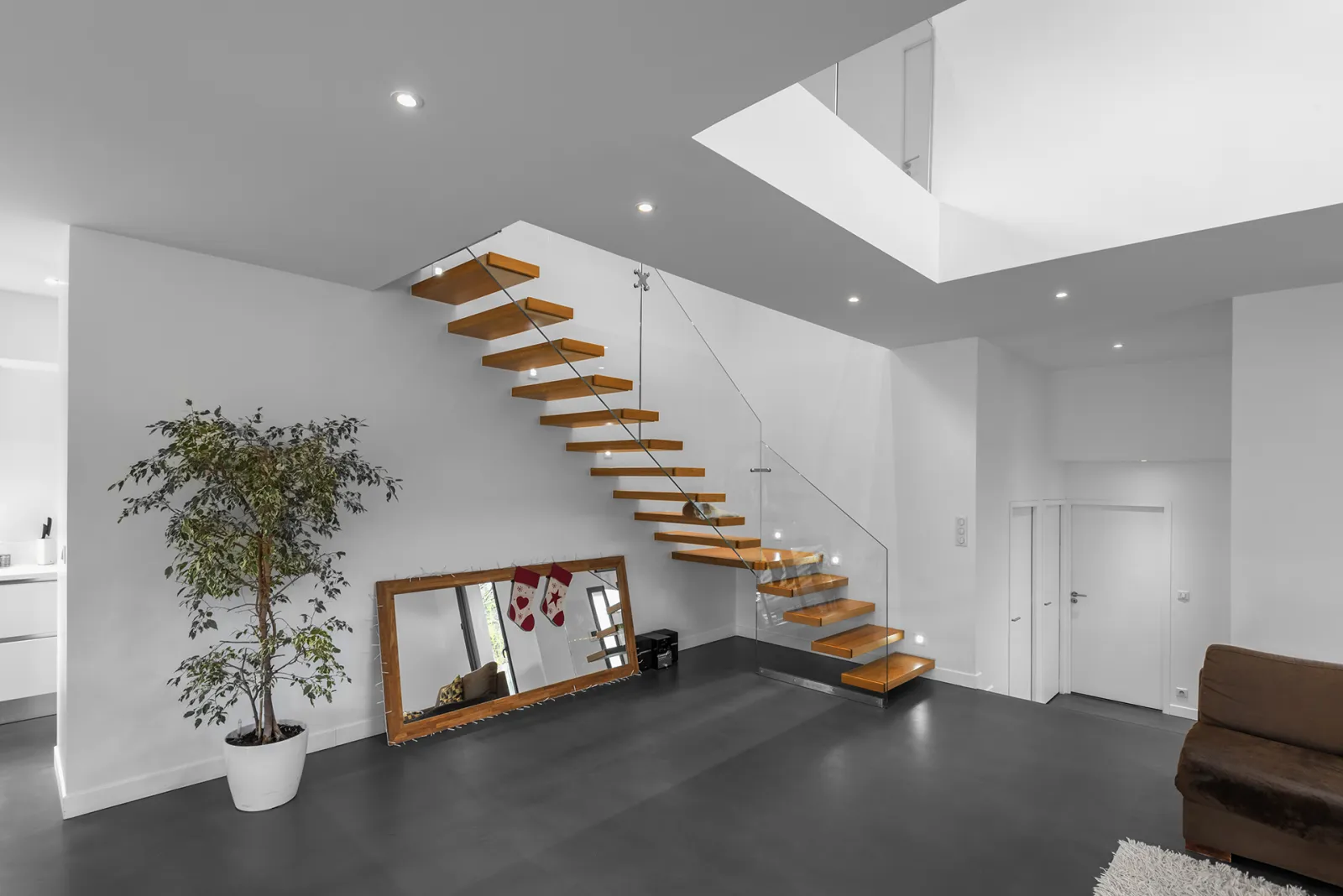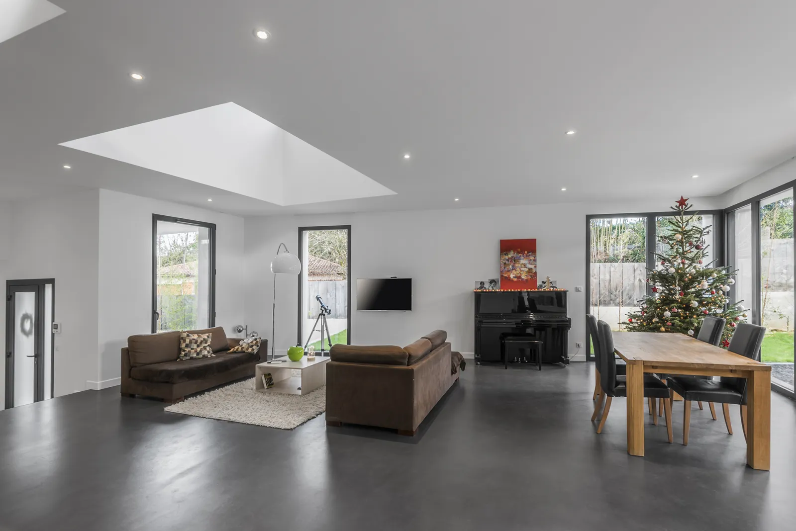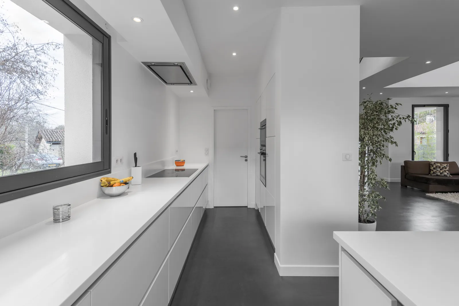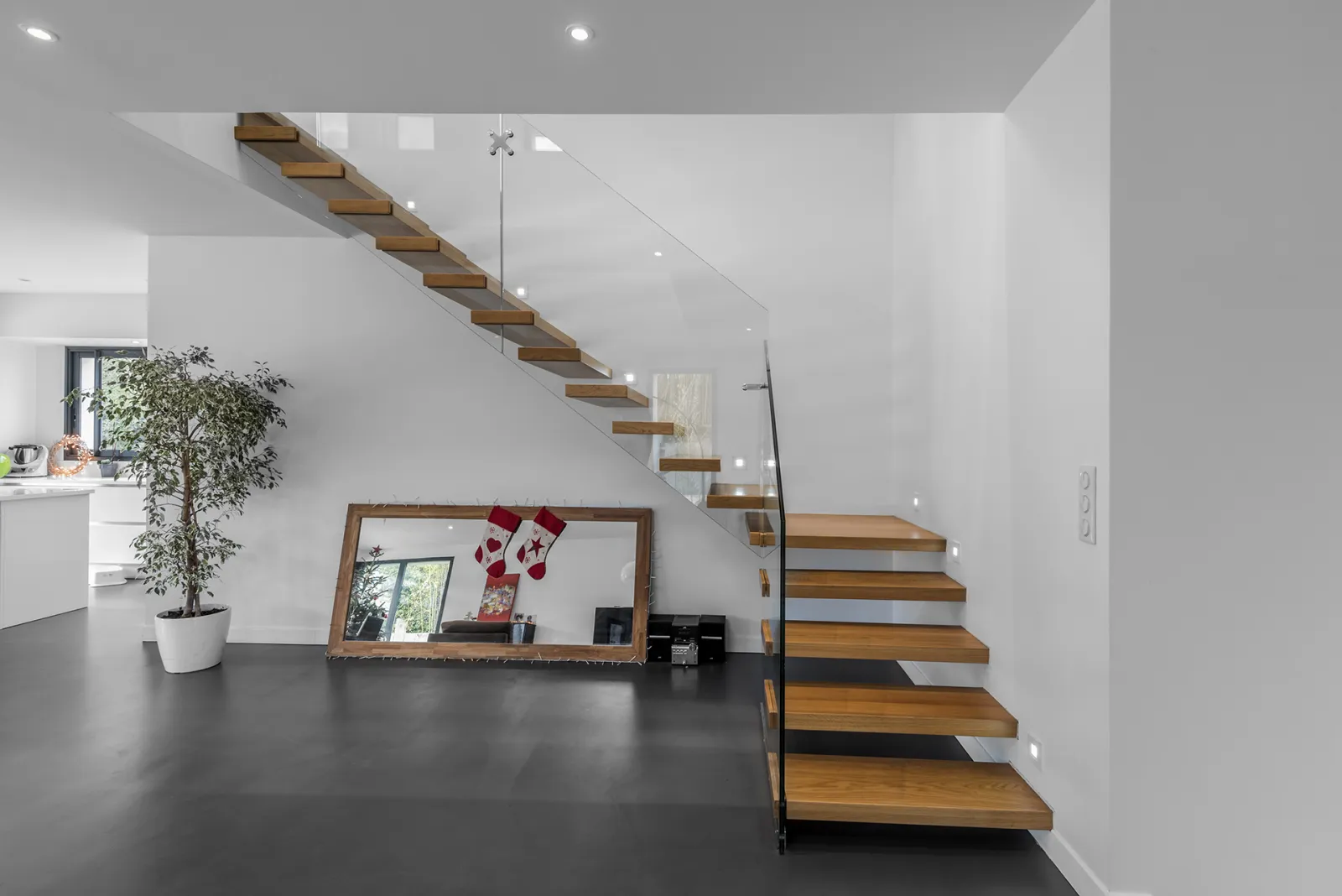 La conception de cette maison s'appuie sur la pente naturelle du terrain pour proposer des espaces à différents niveaux. Le projet se compose de 3 volumes imbriqués qui accueillent chacun des espaces spécifiques. Cela confère au projet des lignes dynamiques. Un porte à faux à l'étage s'élance au dessus de la terrasse pour protéger les ouvertures du RDC. Cet étage permet de créer des perspectives intérieures par l'intermédiaire d'un vide sur salon séjour et d'une passerelle qui dessert les espaces nuits de l'étage.