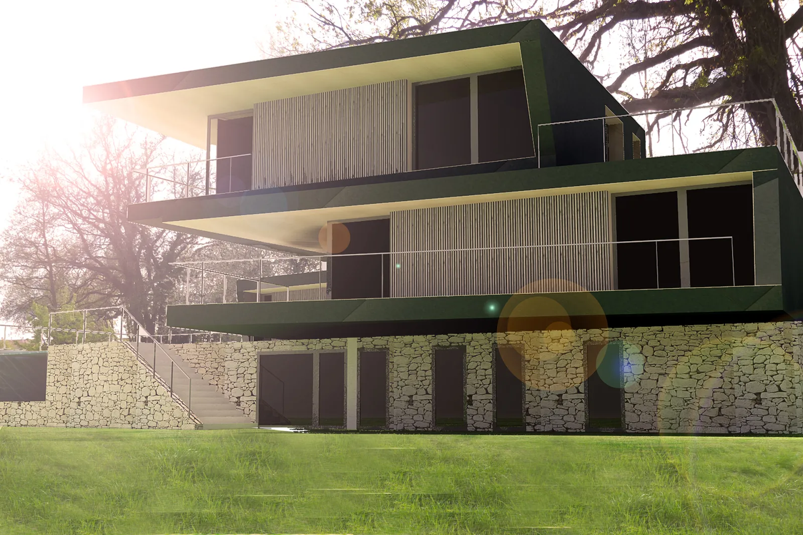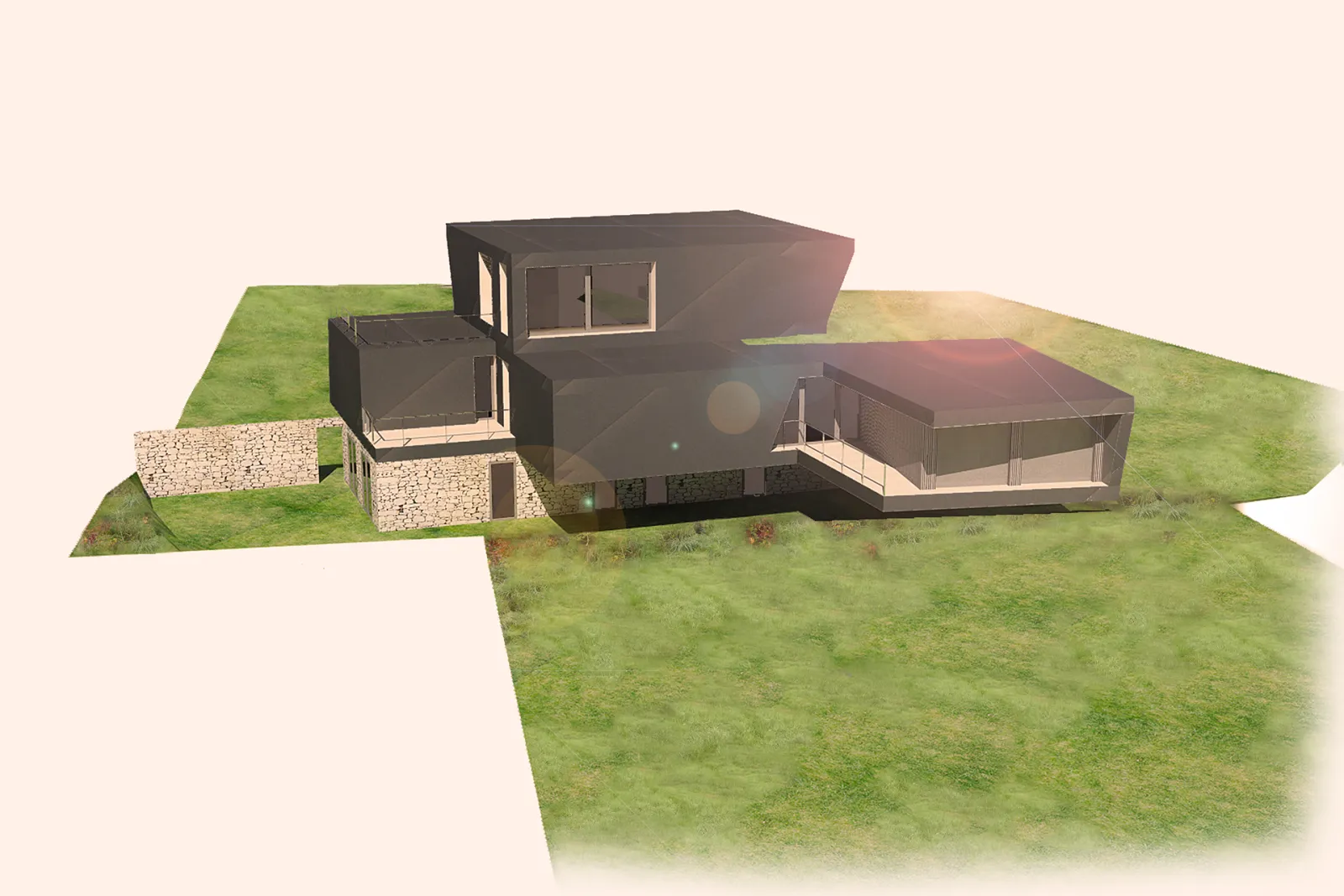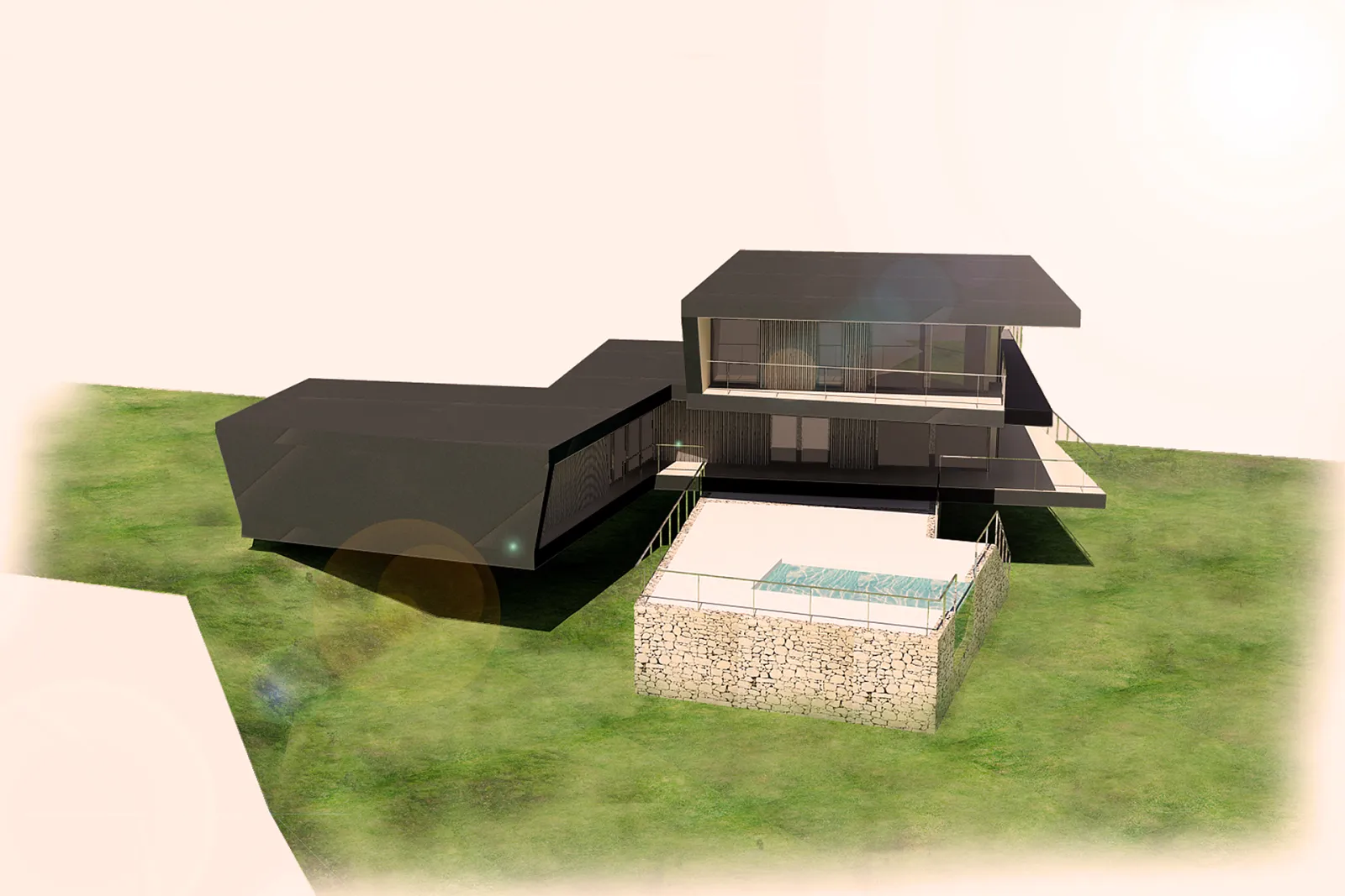 Un projet de maison individuelle non réalisé. L'écriture architecturale de ce projet prévoyait 3 strates différentes légèrement décalées par niveaux. Le RDC était traité de façon minérale correspondant au socle de la maison. Les deux autres strates étaient traitées de façon plus légères avec des débords et des portes à faux.