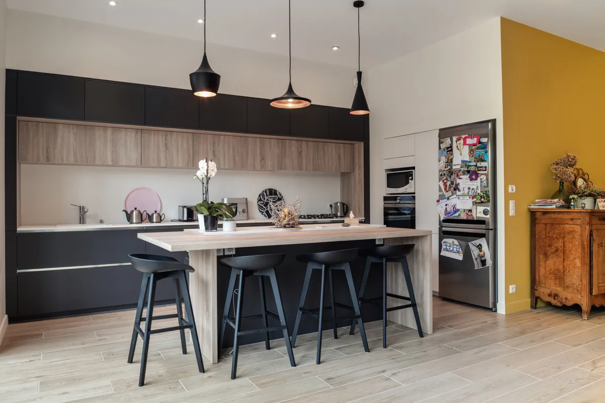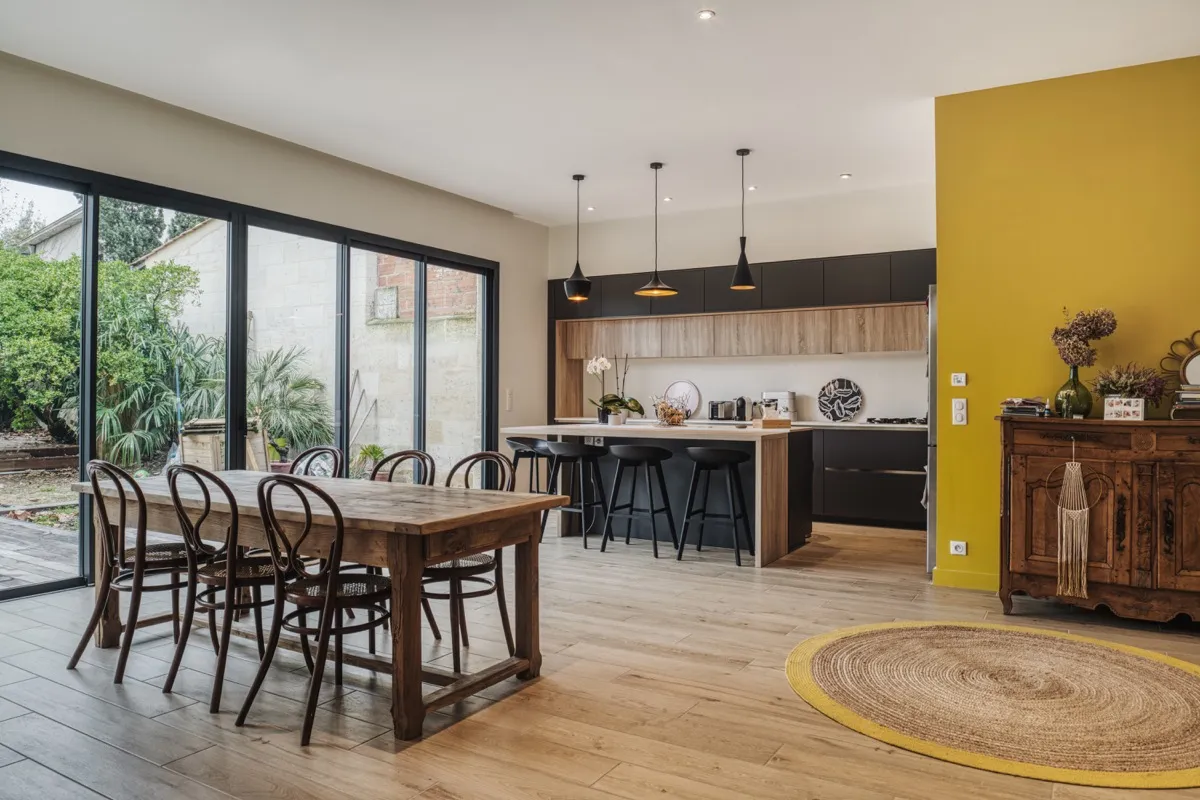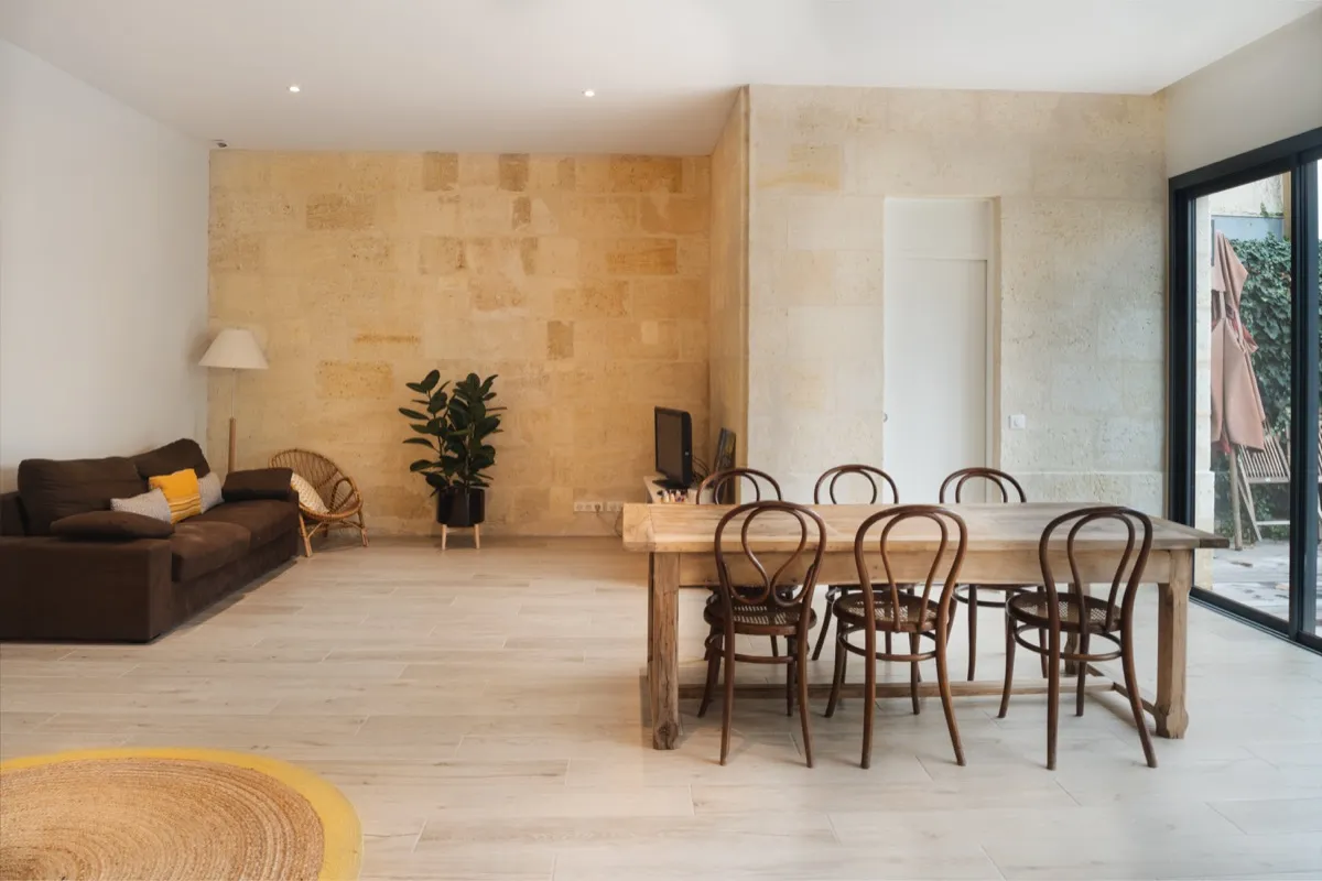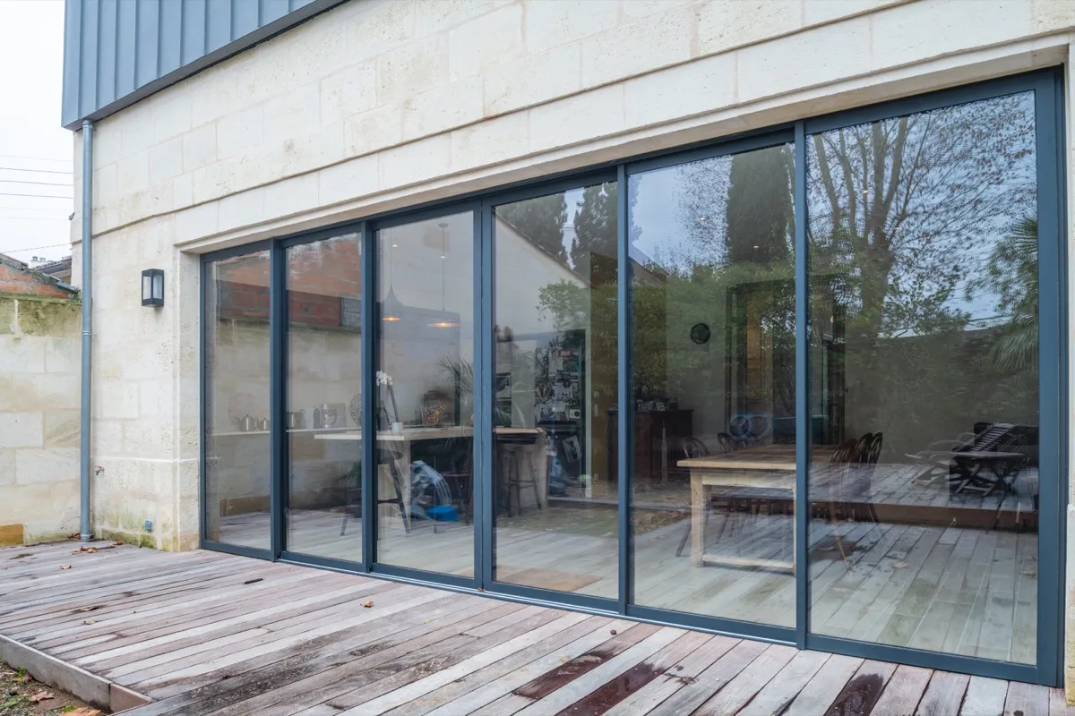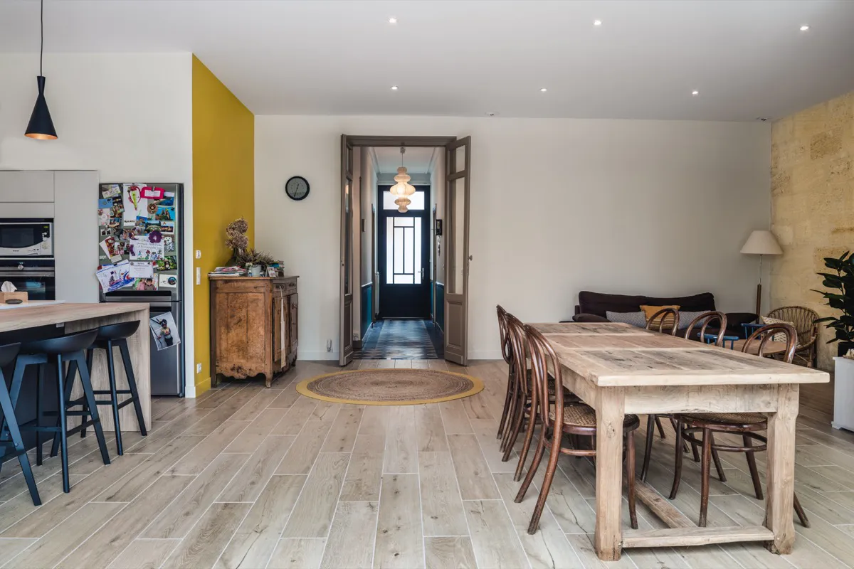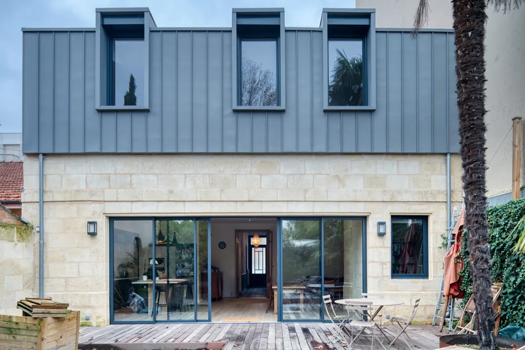 Le RDC a conservé uniquement les deux pièces sur rue qui avaient déjà fait l'objet d'une précédente rénovation. Une extension sur le jardin a été réalisée avec la mise en place d'une cuisine et d'un coin bureau. Sur la façade arrière, une grande ouverture à l'aide d'un IPN a été réalisé, puis un placage pierre est venu habiller la façade. L'étage a lui était traité de façon plus contemporain, avec un bardage zinc et trois fenêtres élancées marquant chacune des chambres.