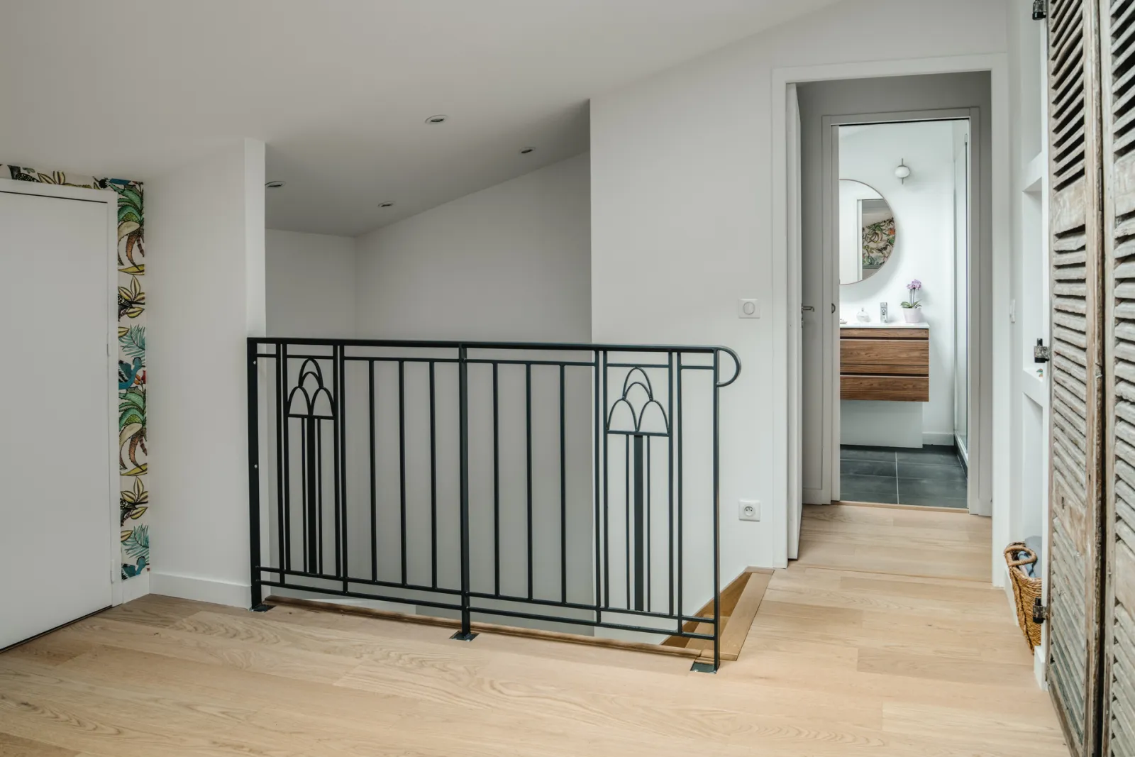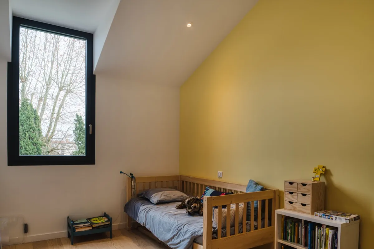 La façade arrière sur jardin étant tournée plein sud, une surélévation partielle ne présentait pas un réel problème. Nous avons pu inscrire trois chambres à l'étage donnant sur le jardin plein Sud. L'espace central uniquement éclairé par le biais de velux, a permis d'y insérer une salle de bain, une salle d'eau parentale, et l'accès à ce nouvel étage et un grand rangement.