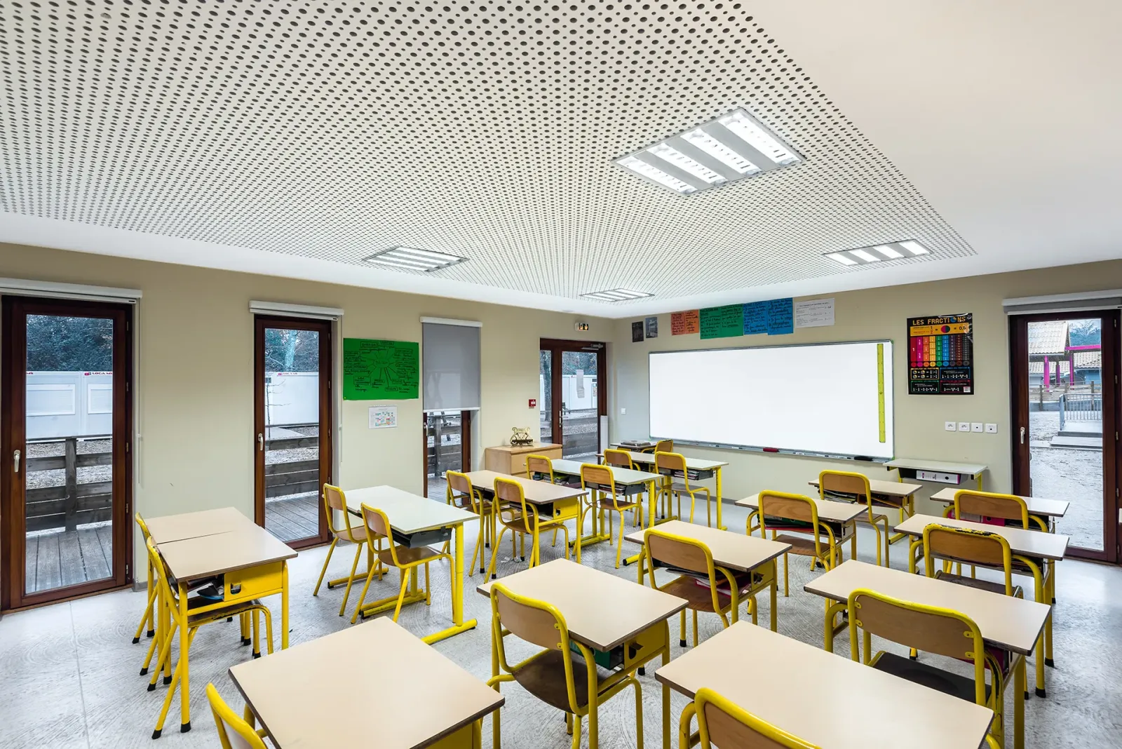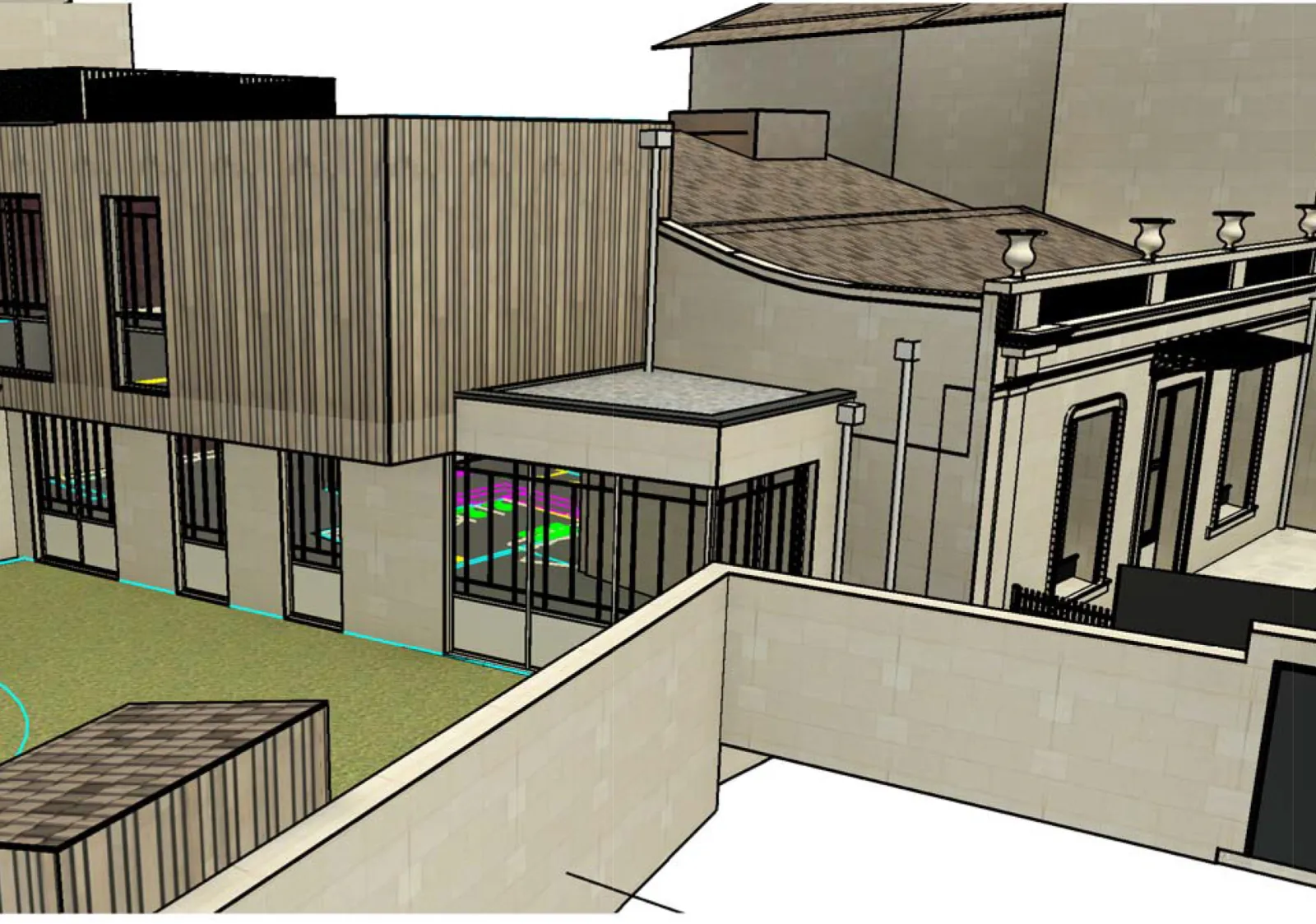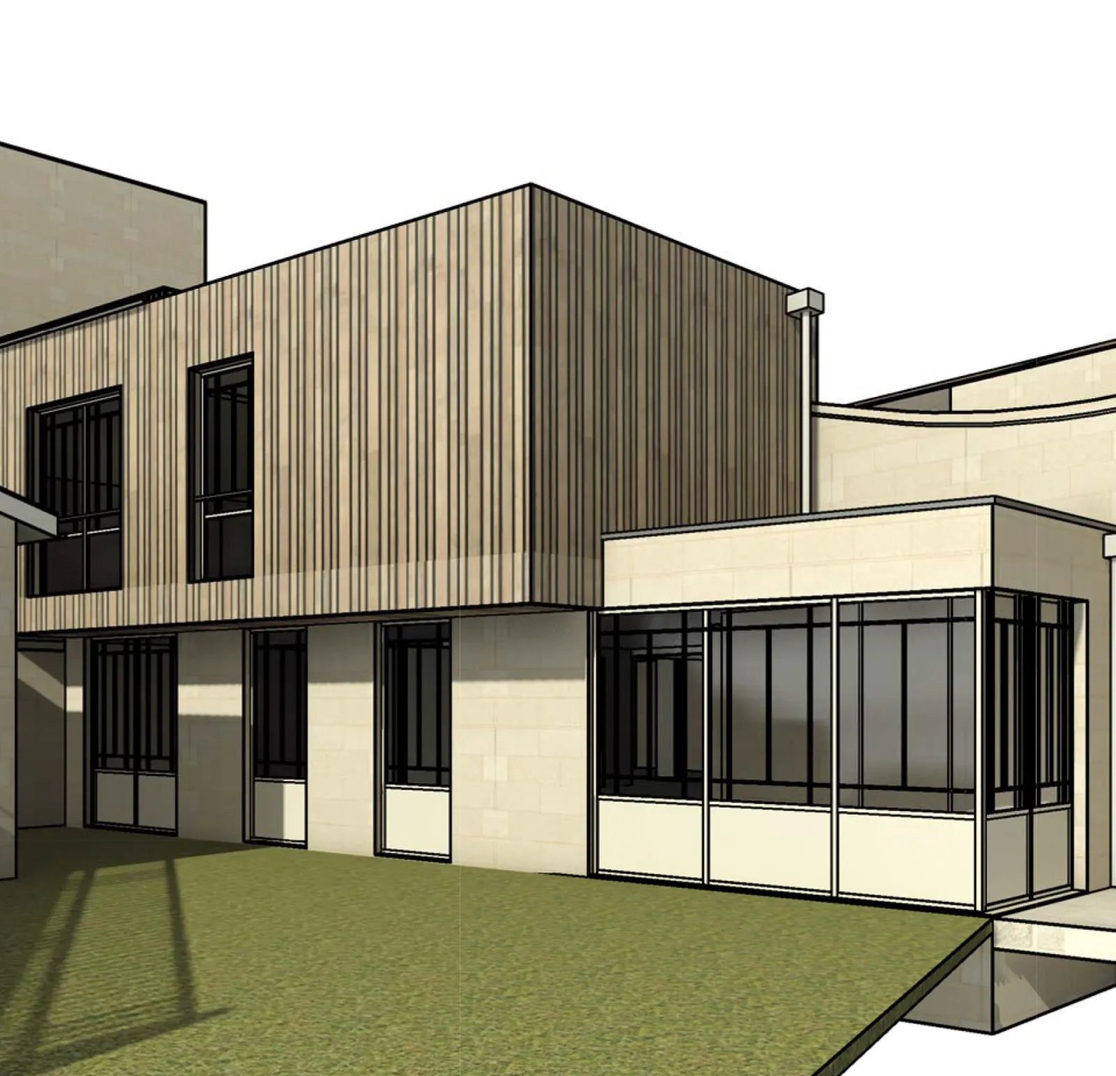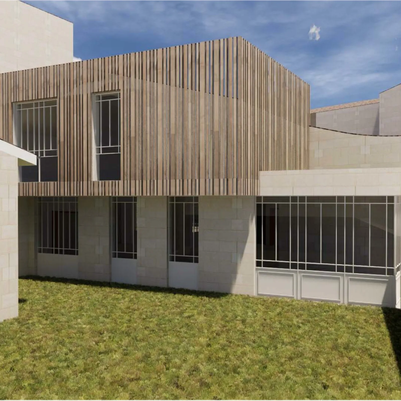 Le projet conserve la clôture sur rue et la façade du bâtiment existant principale car ils sont protégés. La surélévation concerne le bâti principal et se fera dans la continuité de la toiture existante tandis que l’extension se fera sur le côté en RDC créant un jardin clos en second rang. Le projet met en juxtaposition la rénovation du bâti ancien en pierre et l’extension moderne par un volume épuré en bois naturel. Le dessin des menuiseries permet de donner une cohérence élégante à l’ensemble. Les toitures terrasses, le patio, la terrasse à l’étage, le jardin clos et le parvis offriront une diversité d’espace et d’appropriation aux usagers de la cèche.